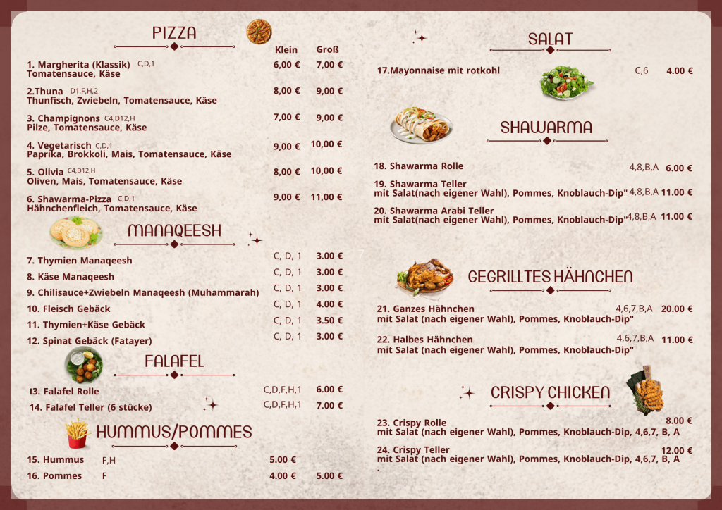 Unsere Speisekarte bietet eine Vielfalt an orientalischen Köstlichkeiten – von saftigem Shawarma und knusprigen Falafel bis hin zu frischen Salaten und leckeren Pizzen.